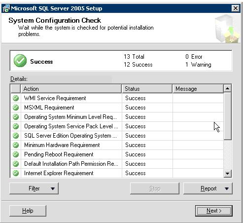 Next, the installation wizard will scan your computer or server's hardware to ensure that it is able to run SQL Server 2005 with ease. If any errors or warnings get flagged up, we suggest that you take notice of these to ensure that your installation of SQL Server 2005 goes smoothly.