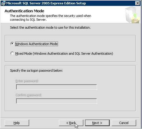 The next option to set is the authentication mode. There are two different types of authentication for SQL Server 2005: