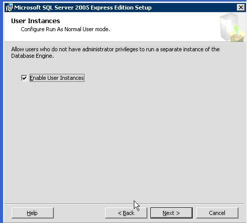 You should then enable the option for regular user instances, since without this option SQL Server 2005 might not be able to run correctly if you want it to host more than one SQL database.