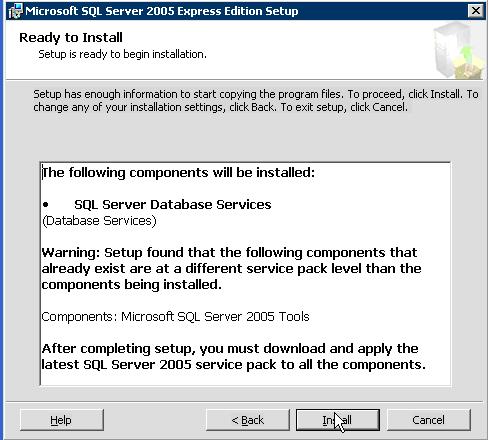 Finally, if you click the 'Next' button near the bottom of the window and then the 'Install' button on the next screen, SQL Server 2005 Express Edition should install.