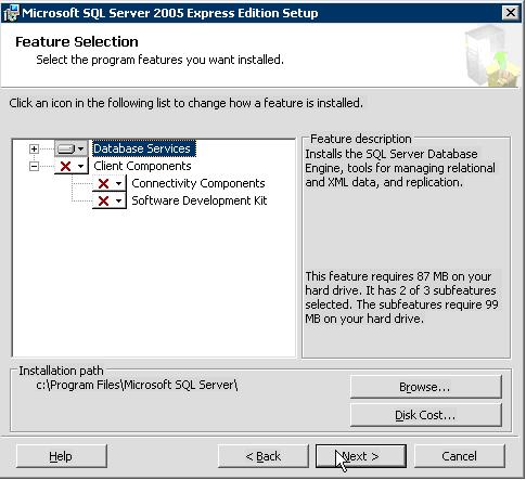 The first advanced configuration option to set is the components that you want to have installed along with SQL Server 2005 Express. By default the server components are installed, but the client components aren't. This option might be of help to you if you need a customize installation of SQL Server 2005.