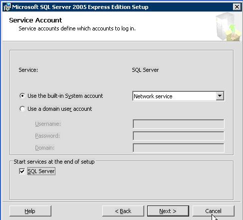 If you are an advanced server administrator, then you might want to define the user account that the SQL Server service uses to start and to login to the server. By default, the built in network account is used to ensure SQL Server 2005 runs smoothly.
